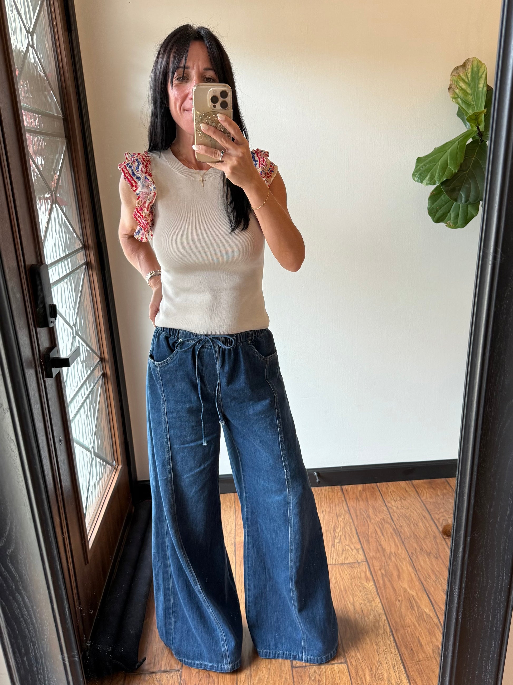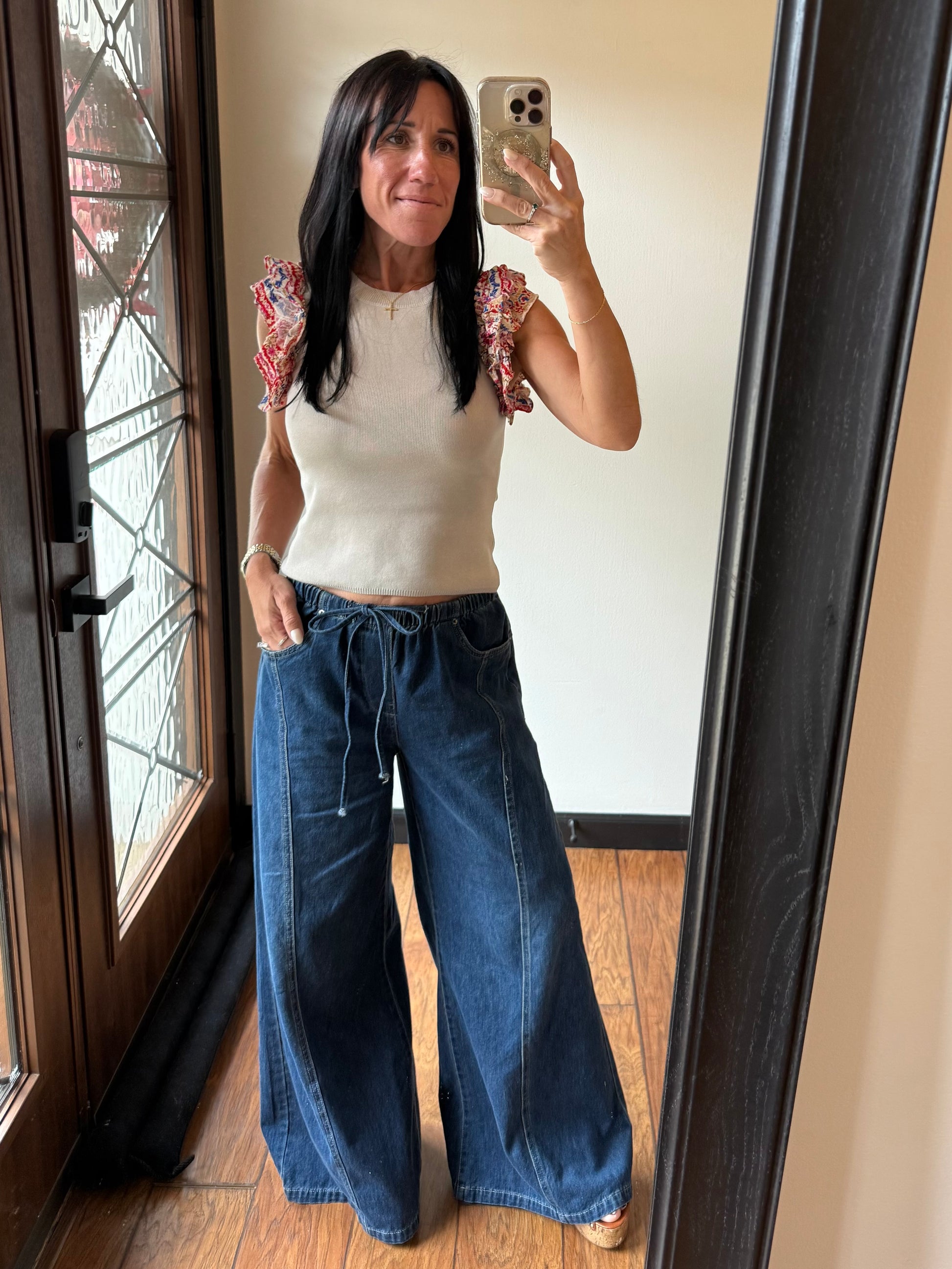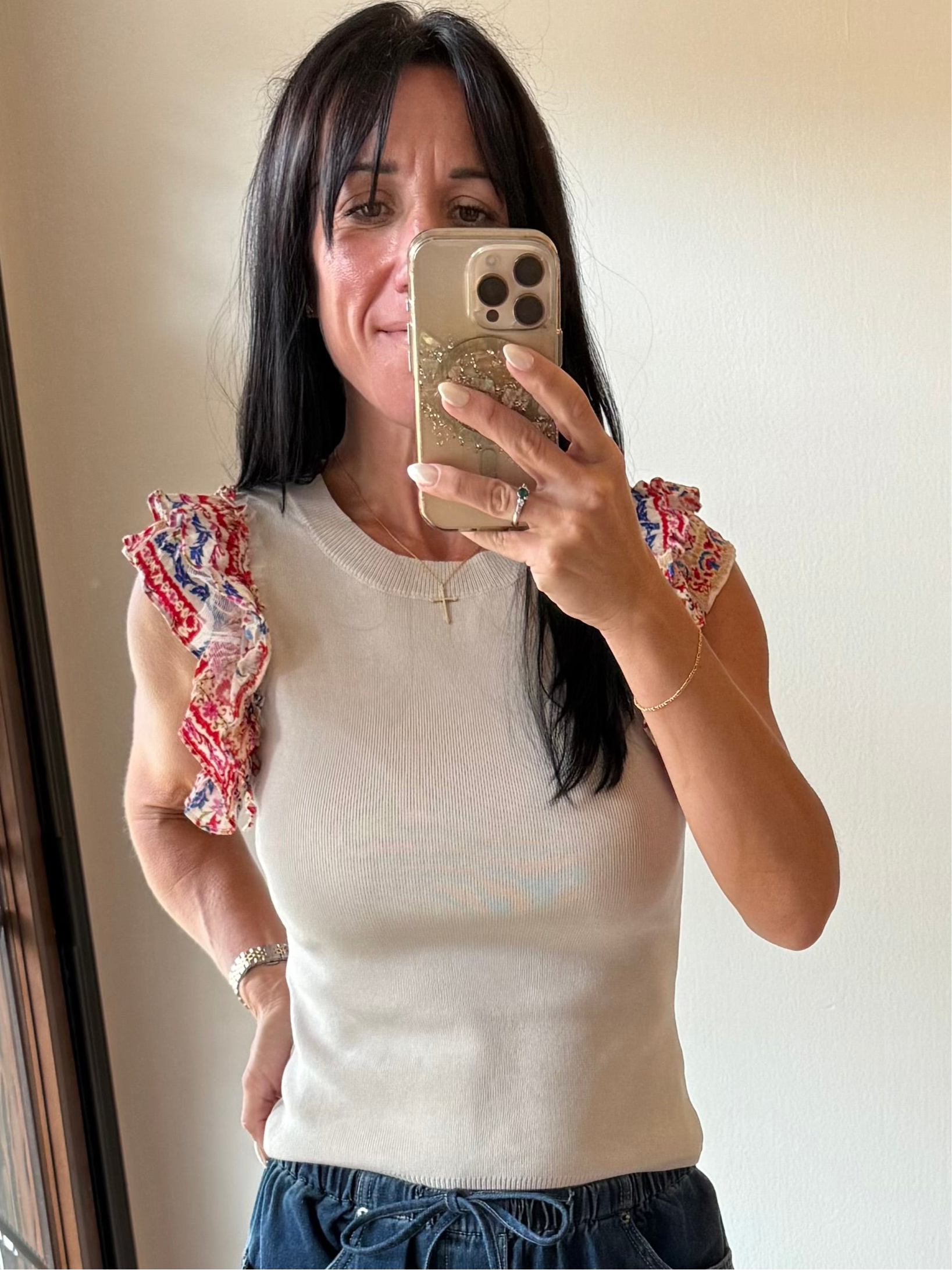 This light weight knit tank with a fun red & blue print ruffle sleeve is the perfect top to take you from summer to fall. Looks and feels high end without the high end price tag.
